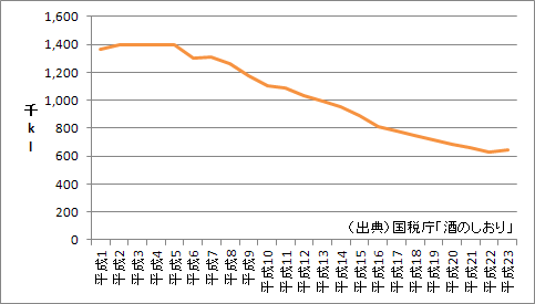 一目瞭然ですが、右肩下がりで落ち込んでおり、最盛期の半分以下の数量となっています。この点を見る限り、日本人の日本酒離れが進んでいると言えるでしょう。