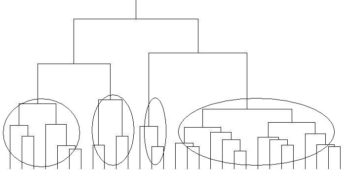 何段階もの分岐点があり、その分岐により、一つのまとまり(クラスター)として分類します。下図でいうと、丸で囲んだデータがそれぞれ一つのクラスターであり、似たものとして分類されます。